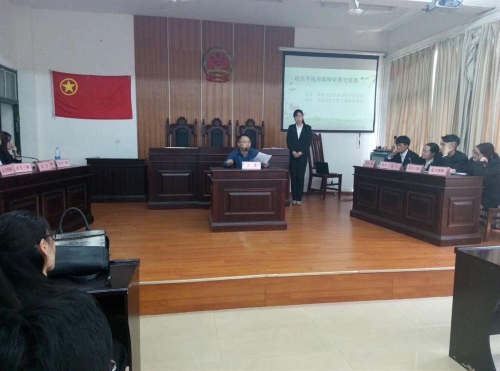 为提升我院学生的应变能力和辩手们的辩论能力,为校级辩论赛做好准备。2007年4月21日中午我院在英华楼模拟法庭举办政法学院内部辩论赛交流赛。担任本次辩论赛的评委有团总支书记罗燕妮老师、16思政班班主任乔兰老师、凌焰博士,并组织了16级全体学生观看了本次比赛。