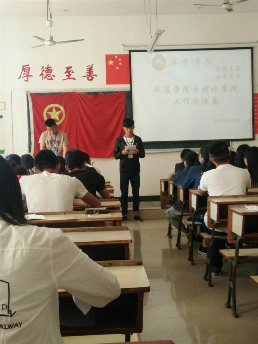 为更好开展与推进团总支学生分会的工作,在5月9日的常规例会结束以后,我院团总支副书记黄彦润和学生分会主席段崇裕带领部分团总支学生分会成员去鼎新楼2313教室与材化学院团总支学生分会开展了一场团学工作交流会,材化学院团总支学生分会主席宋蔚昌代表材化学院团总支学生分会对我院团总支学生分会成员的到来表示欢迎。