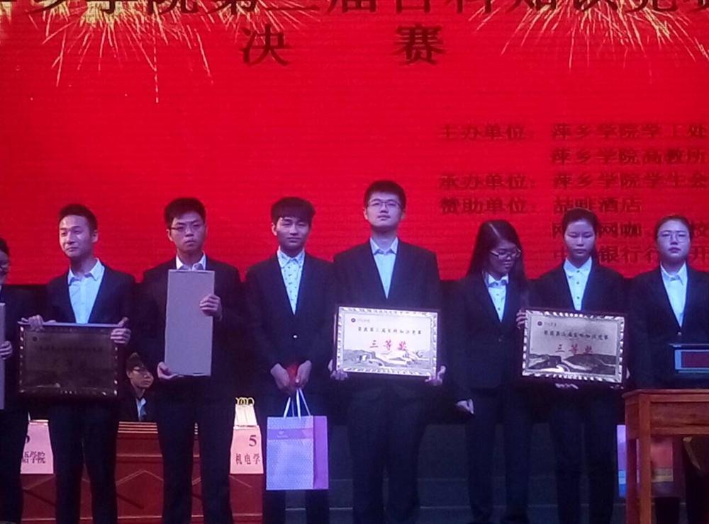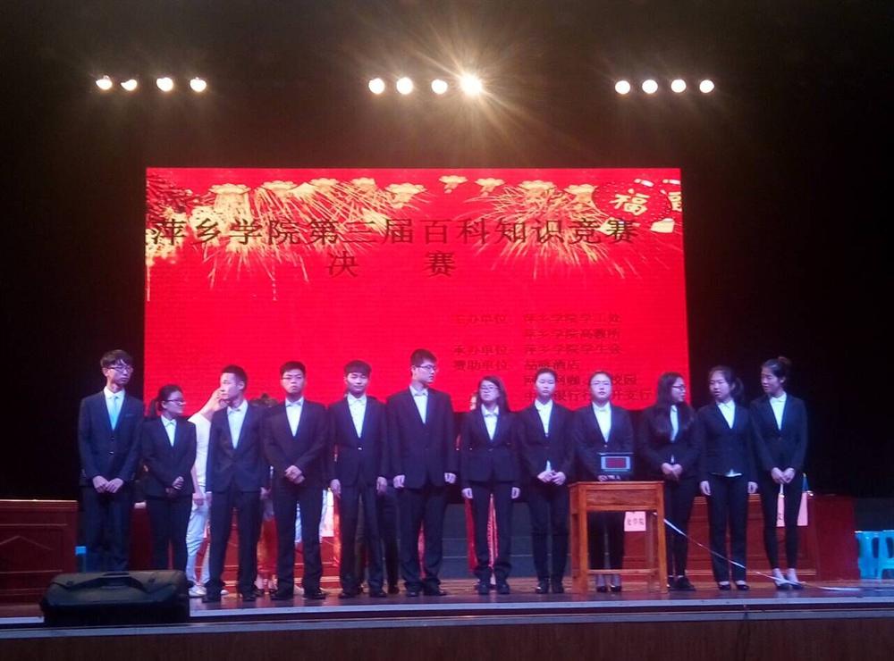 2016年4月24日晚,校学生会在音乐厅举办第三届百科知识竞赛。我院派出三名优秀的选手组队参加了此次比赛,经过预赛的选拔,我院最终进入决赛,并获得了第三名的好成绩。知识的奥妙与乐趣,让我们久久不能忘怀,希望我院的学子们更加努力学习,领略读书的美好和崇高。