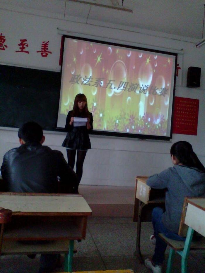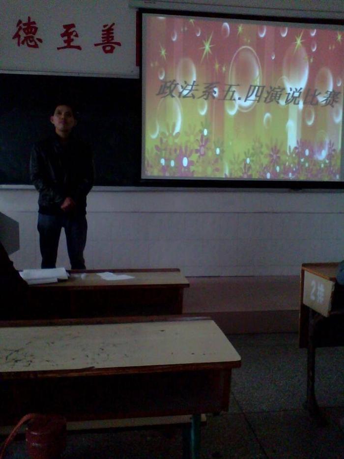 为纪念“五四”青年运动95周年,丰富校园文化生活,创造和谐、奋进、创新的校园文化氛围,并为我校“传承五四之光,奏响青春乐章”演说比赛选拔优秀选手,4月23日中午政法系在跬步楼1103教室举行了五 .四演说比赛初赛。