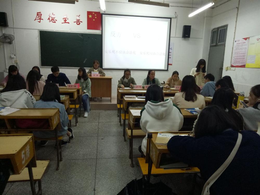 此次辩论赛双方辩手围绕“安乐死是否应该合法化”的辩题展开了激烈的辩论,双方辩手以敏捷的思维和精炼的语言赢得了台下观众的阵阵掌声,在自由辩论时比赛更是达到了高潮,双方辩手唇枪舌剑,互不相让给大家带来了一次精彩的比赛,比赛结束后,先由台下观众谈自己的感受,他们谈到自己辩论时的紧张,也分享了自己总结的经验:要自信,准备充分等等,最后评委对比赛进行点评,肯定了双方辩手熟悉辨稿,准备充分的优点,同时也指出一些辩论技巧上的不足,如语言要精简,善于发现对方漏洞等。在严肃活泼的气氛中,政法学院辩论赛初赛圆满落幕。