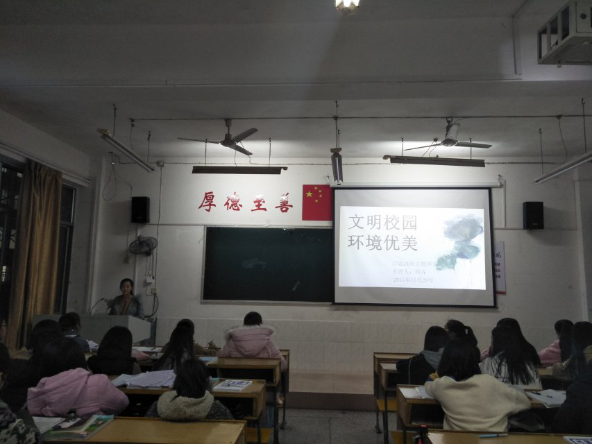 为了提高同学们的环境保护意识,建设美丽校园。11月29日晚,17思政班于跬步楼1104举行了“文明校园,环境优美”主题班会。17思政班全体同学参与本次班会,宣传委员周卉主持班会,张帆博士全程指导。