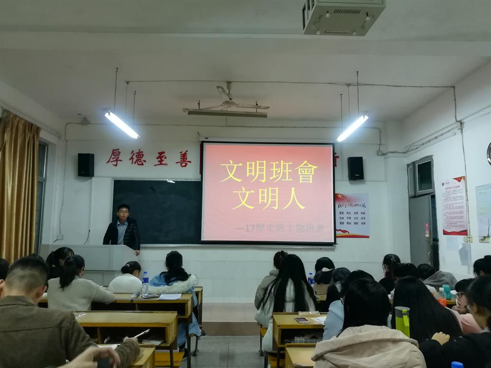 为树立文明观念,提高同学们的综合素质,17历史班于12月6日晚在跬步楼1111教室召开了“文明校园.文明人”主题班会,参加班会的有凌焰博士和历史班全体同学,此次班会由班长吴文伟主持。