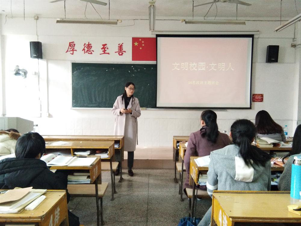 2017年12月5日,政法学院16思政班在跬步楼1106举行了“文明校园·文明人”主题班会,班会由乔兰主持,16思政班全体成员参与。
