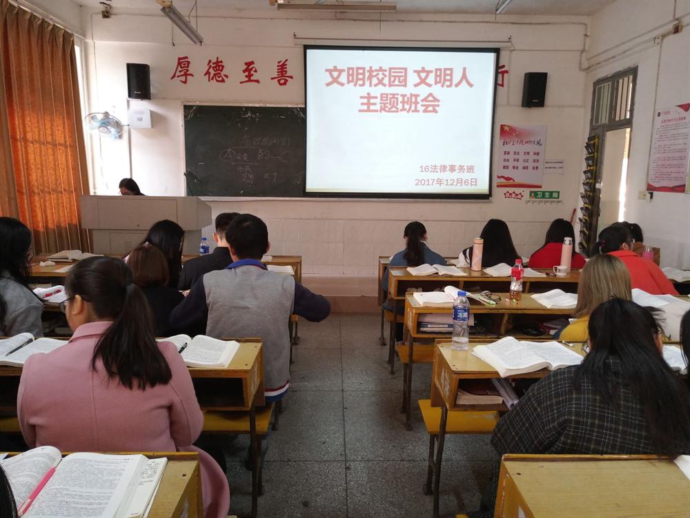 为树立文明观念,提高同学们的综合素质,16法律班于2017年12月6号下午在跬步楼1109召开“文明校园,文明人”主题班会,此次会议由陈冉老师主持,参加会议的有16级法律班全体同学。