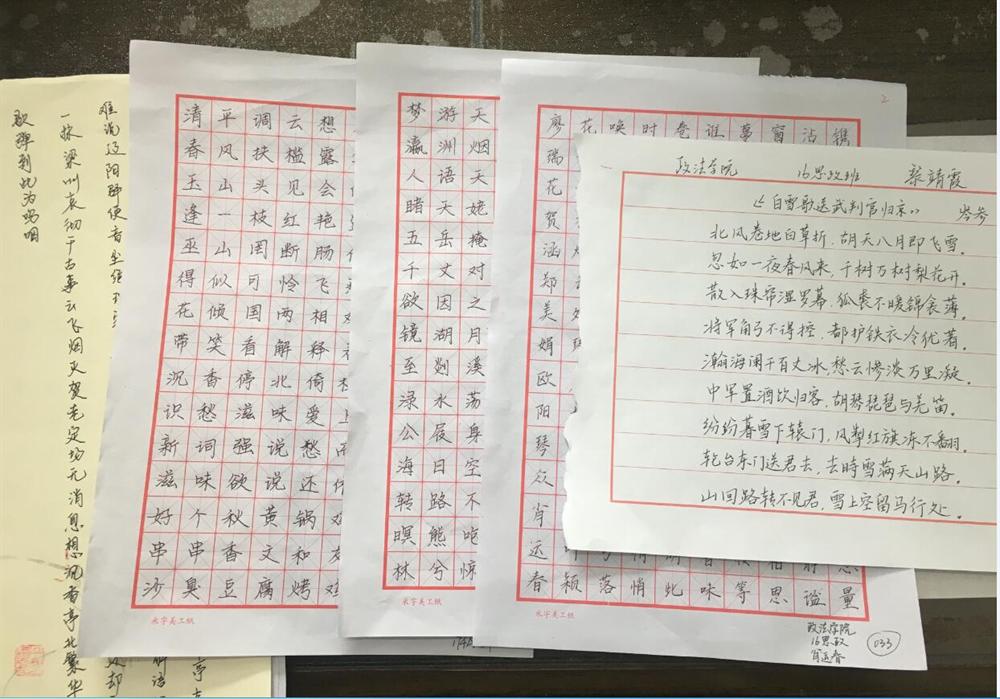 展书法,传文化。政法学院以“展个人书法,绽活力青春”为主题,以弘扬社会主义核心价值观和党的业绩为载体,以毛笔字和硬笔字为表现形式,开展了第一届书法技能大赛。本次活动11月中旬启动,历时两周,最终30件作品入围,其中硬笔字作品数量占作品总数的70%。