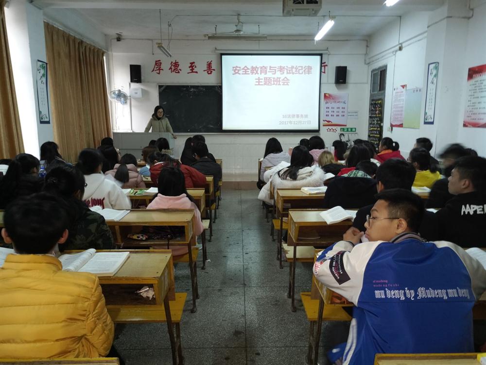 16法律班于2017年十二月二十七号下午在跬步楼1109召开“安全教育与考试纪律”会议,会议由陈冉老师主持,参加会议的有16级法律班全体同学。