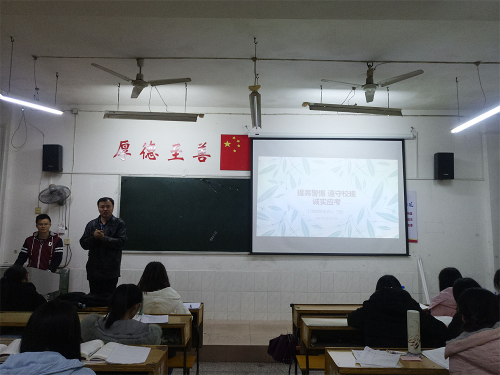 为提高同学们的防患意识,营造良好考风、学风。12月27日晚,17思政班全体同学于跬步楼1104教室举办了“提高警惕,遵守校规,诚实应考”主题班会。班长万松主持本次班会,17思政班全体同学参与本次班会,张帆博士全程指导。