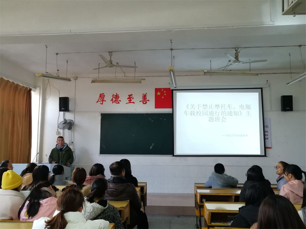 鉴于校内机动车横行,学生安全意识薄弱,为强化寒假前后安全教育,2017年1月10日午间,17思政班于跬步楼1104教室举办了“关于禁令校内机动车通行”的主题班会。17思政班全体同学参与本次班会,生活委员吴友才主持班会,张帆博士全程指导。