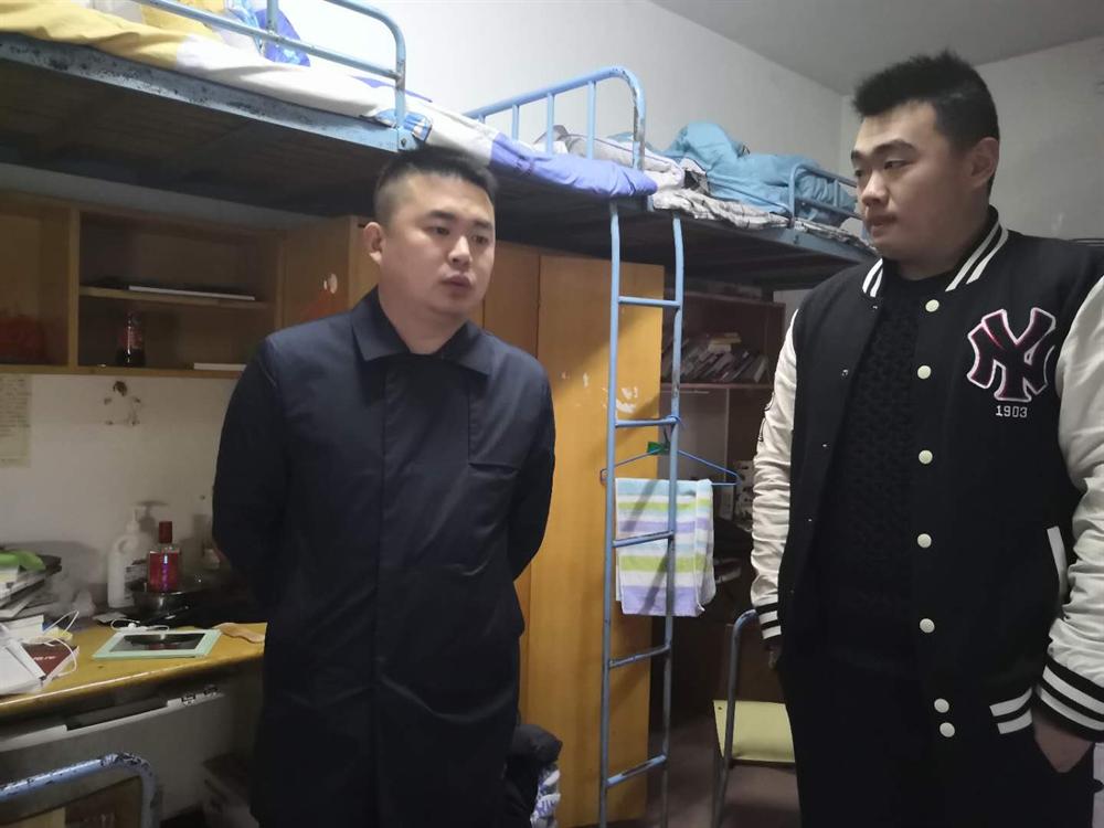 政法学院副书记江惺俊、辅导员阳水根下寝,现场查看我院各宿舍的各项设施,发现问题立即处理;并询问同学们新学期的计划,勉励同学们在新的学期努力学习,创造新的成绩。