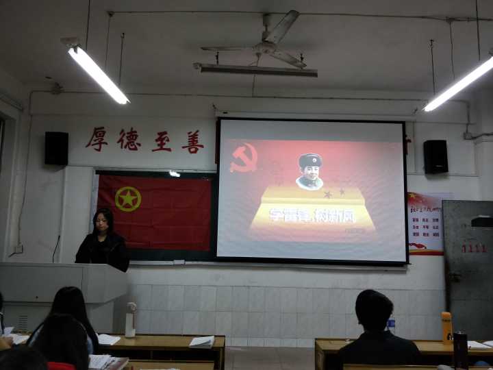 徐萍同学以《学习雷锋好榜样》这首歌切入今晚班会的主题。班会主要分为雷锋生平,雷锋故事,雷锋日记,雷锋语录和雷锋精神五大板块,她强调雷锋同志言行一致,公而忘私,爱憎分明,全心全意为人民服务的精神,讲述了雷锋同志帮助战友学习知识,在生活上照顾战友的故事,分享了“我愿永远做一颗永不生锈的螺丝钉”等语录。