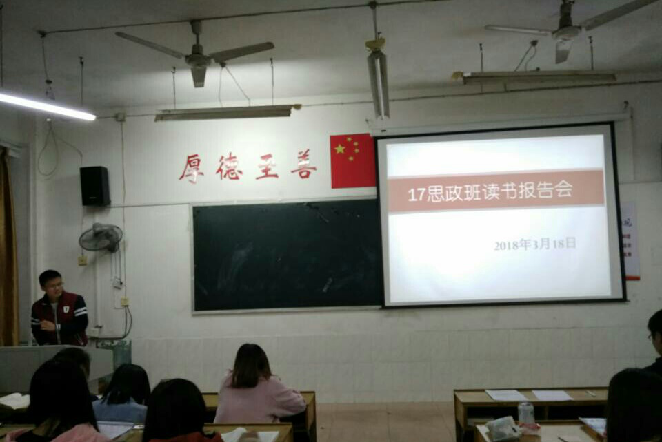为贯彻两会精神,引领学生多读书、读好书风尚,并检验同学们的寒假作业情况。3月18日晚,17思政班于跬步楼1104教室举办了寒假读书报告会,17思政班全体同学参与本次报告会,班长万松为主持人,李博一老师与部分同学担任本次报告会评论人。会上气氛活跃,热情高涨。