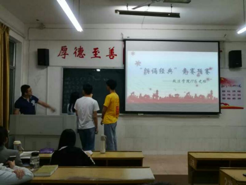 为深入贯彻党的十九大精神,引领青年大学生进一步学习习近平总书记系列重要讲话精神,弘扬中华优秀文化传统,增强文化自信和民族自豪感,我院积极响应校园读书周活动,举办了“朗读经典、浸润人生”竞赛主题活动。4月19日晚上,政法学院全体学生利用晚自习时间在各班举行了本次活动的初赛。