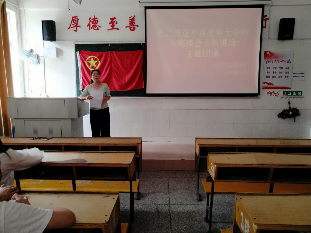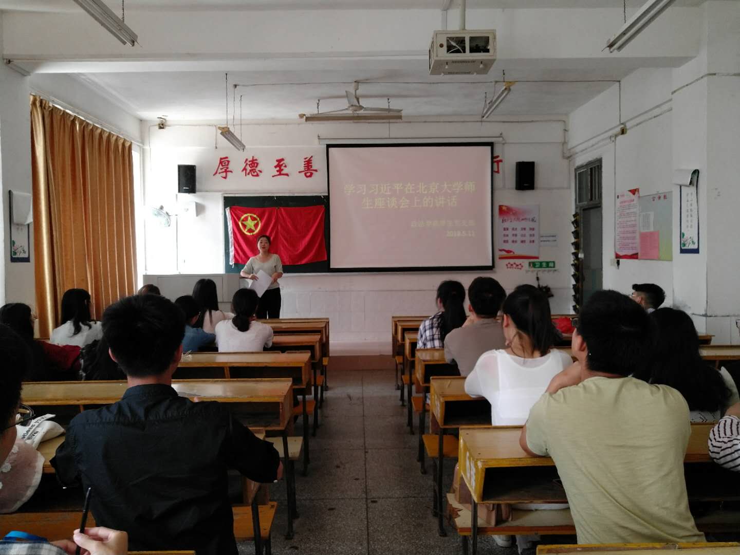 2018年5月11日下午16:30,政法学院团总支在跬步楼教室召开了“学习习近平总书记在北京大学师生座谈会上的讲话”主题团课活动。政法学院党总支书记叶继林、副书记江惺俊团总支书记罗燕妮、辅导员阳水根老师以及政法学院各班优秀团员。会议由罗燕妮老师主持。