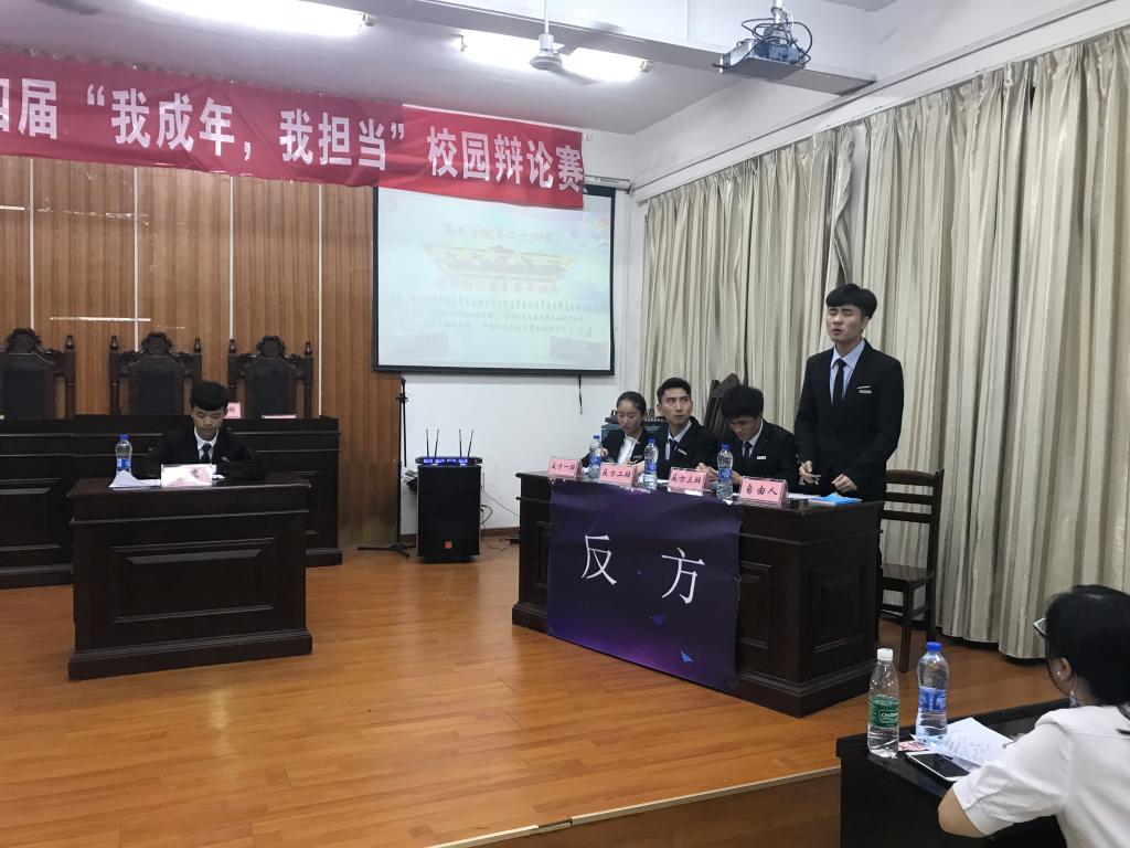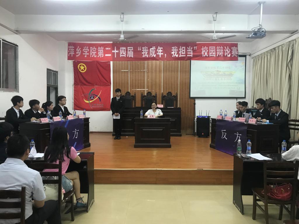 萍乡学院第二十四届“我成年,我担当”校园辩论赛于5月16日晚在英华楼模拟法庭举行。此场辩论赛可谓是打入比赛前四强的关键一局,与政法学院进行对阵的是信计学院,双方旗鼓相当,展开了一场唇枪舌战。此次辩论赛特邀学校优秀指导老师担任裁判,我院团总支书记罗燕妮老师、辅导员阳水根老师和同学们一起观看比赛。