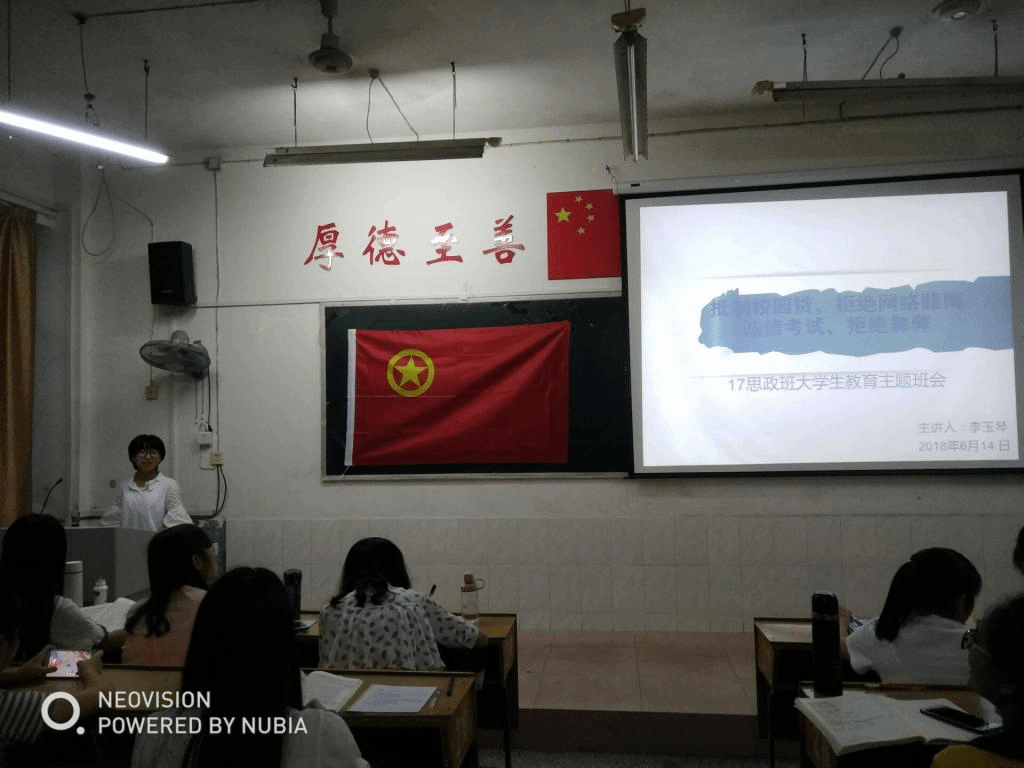 为提高同学们的风险防范意识,树立科学理性消费观。2018年6月14日晚,17思政班全体同学于跬步楼1104教室举办了“抵制校园贷,拒绝网络赌博,诚实应考,拒绝舞弊”主题班会。李玉琴同学主持本次班会,17思政班全体同学参与本次班会,张帆博士全程指导。