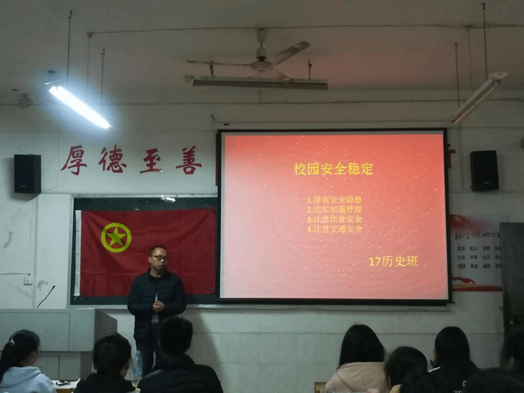 为增强同学们安全意识,提高自我保护能力,创建平安校园,11月20日晚7点,政法学院17历史班在跬步楼1111教室召开“校园安全稳定”主题班会。17历史班班主任凌焰博士全程指导班会。会议由体育委员陈鏘滨主持。