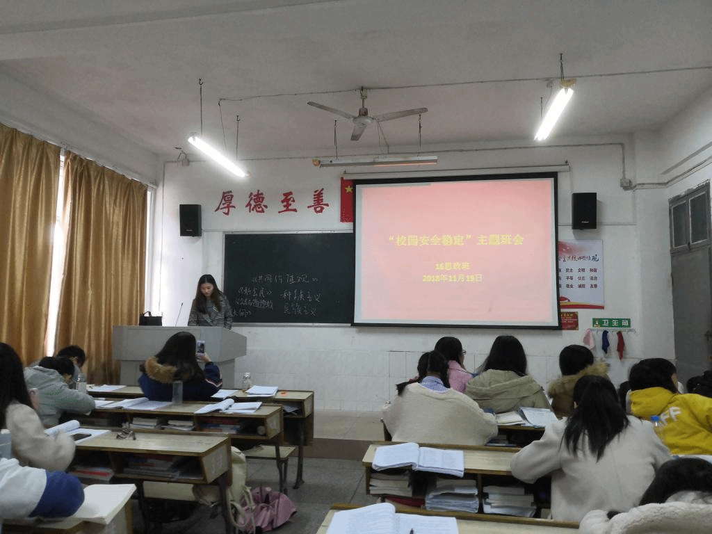 为加强校园安全稳定工作,切实加强管理,16思政班11月19日在跬步楼1106召开“校园安全稳定”专题班会,此次班会由班长廖玉林主持,班主任乔兰全程指导。