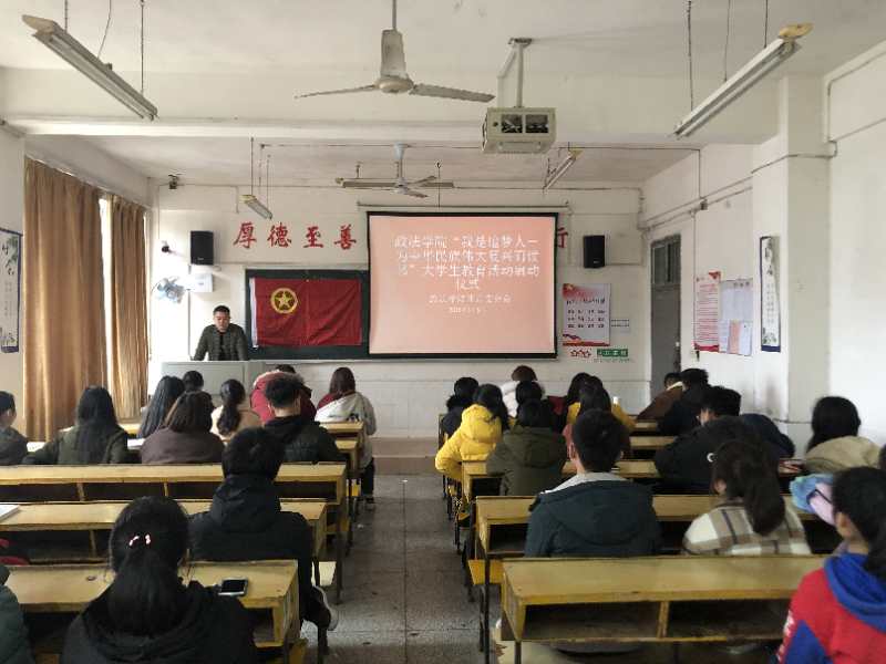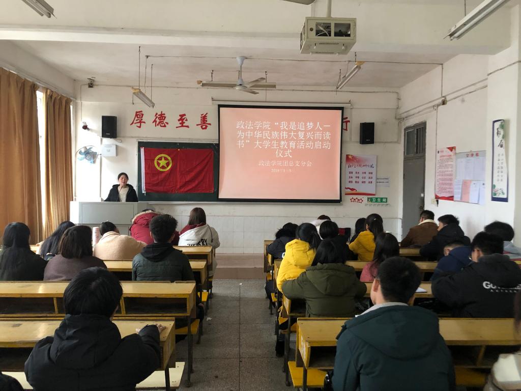 为深入贯彻落实党的十九大精神和习近平新时代中国特色社会主义思想,创造性抓好大学生思想政治教育工作,落实立德树人的根本任务。3月5日中午,政法学院于跬步楼1109举行“我是追梦人-为中华民族伟大复兴而读书”主题教育活动启动仪式。参加本次会议的有政法学院党总支副书记江惺俊、团总支书记罗燕妮,以及政法学院团总支学生分会的成员们。本次活动由陈芮娴主持。