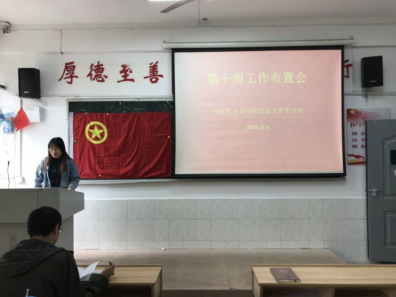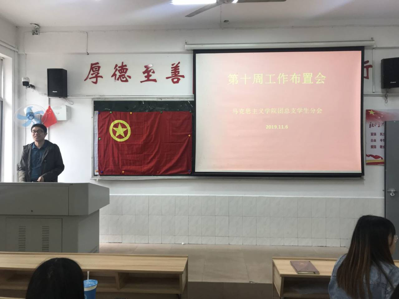2019年11月6日,马克思主义学院团总支学生分会在跬步楼109举行了第十周工作布置会。团总支书记陈尧嘉、学生会主席廖妍婷及其他学生会成员参加了此次布置会。