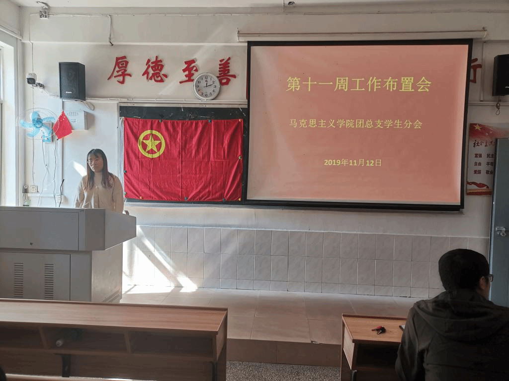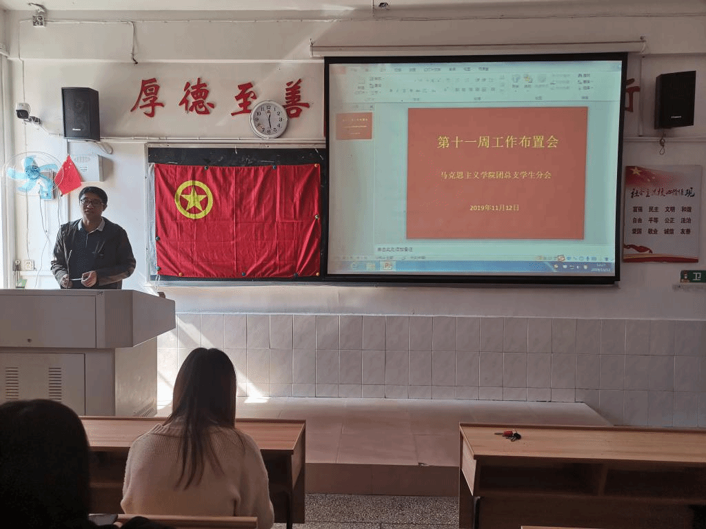 马克思主义学院学生分会于2019年11月12日在跬步楼1109教室召开第十一周工作布置会。参加会议的有团总支书记陈尧嘉老师,学生会主席廖研婷及学生会全体系干。