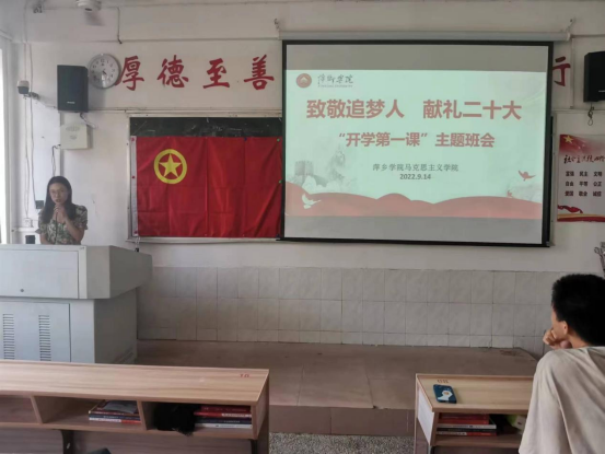为迎接党的二十大,贯彻“安全第一、预防为主”的安全教育方针,提高学生安全意识,构建和谐平安校园,2022年9月14日,马克思主义学院22思政班于跬步楼1109组织展开了开学第一课暨防诈骗安全主题班会活动。本次班会由辅导员段杉主持,22级思政班全体同学参与。
