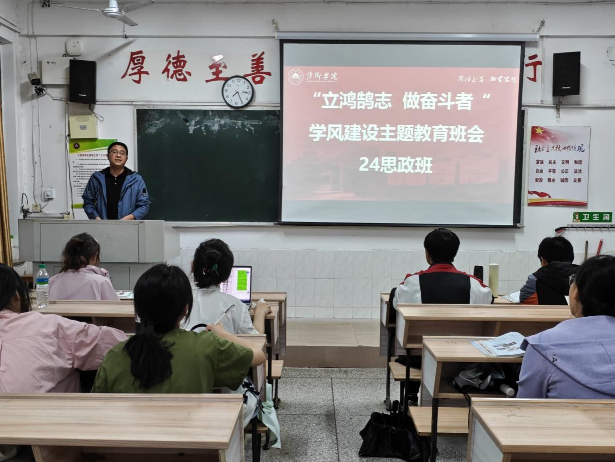 为深入贯彻落实党的二十届三中全会精神和全国教育大会精神,全面落实立德树人根本任务,号召全体学生以主人翁姿态投身学风建设,主动践行课堂规范、主动参与评估任务,以学风建设赋能学校本科教育审核评估工作,建设更加美好的校园环境。4月23日,马克思主义学院于跬步楼1109开展“立鸿鹄志,做奋斗者”学风建设主题教育班会。本次班会由24级辅导员陈尧嘉主持,思想政治教育2401班全体同学参与。