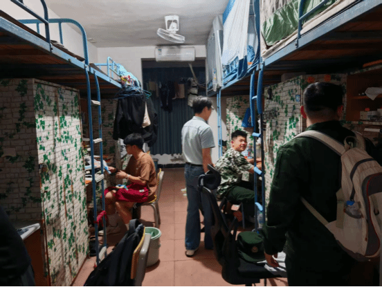 走访过程中,得知一名男生因军训时长时间保持队列姿势,训练结束后出现小腿抽筋症状,凌老师与班级同学一起为该同学按摩与热敷。刘老师细致叮嘱同学们军训注意事项:训练前要做好热身,间隙适当活动腿部,睡前可用热水泡脚预防抽筋,还特意留下联系方式,让学生有不适随时联系。他们的贴心关怀,让男生卸下了痛苦与不安,真切感受到来自学院的温暖。