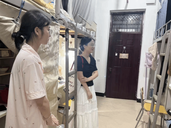 夜幕初垂,结束一天严格军训的新生们刚回到寝室,便迎来了老师们的亲切到访。刘瑾老师和凌金云老师逐一走进每间宿舍,与同学们进行了面对面、心贴心的交流。“军训累不累?”“饭菜合不合口味?”“生活上还有什么困难?”一句句朴实关切的问候,迅速拉近了师生间的距离。老师们针对军训期间的纪律要求、内务整理、健康安全等事项进行了再叮嘱、再提醒。